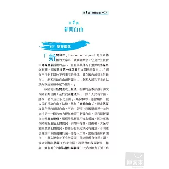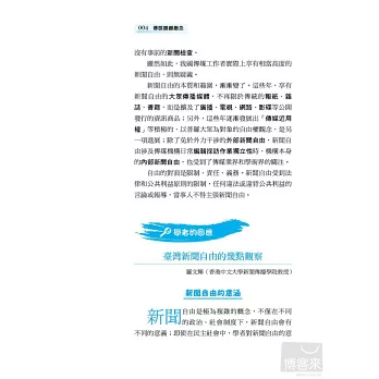 每一講次都包含了「基本觀念」、「學者的回應」、「問題討論與作業」三部分。編者很榮幸邀請到國內11所大學的20位新聞傳播領域教授,參與、撰寫「學者的回應」,大大增加了本書的在地適用性,非常值得大家一讀。