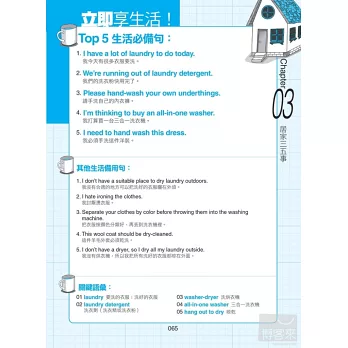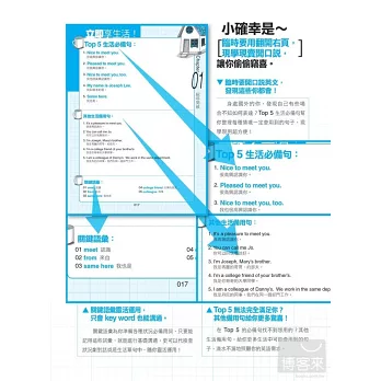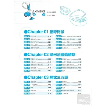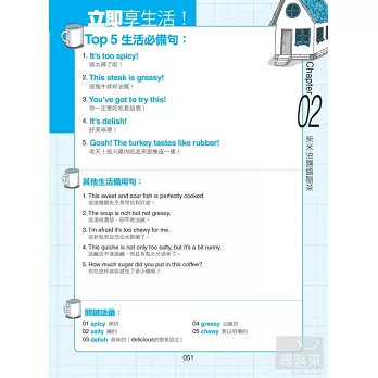 而『Top 5 生活必備句 & 其他生活備用句』,則提供其他在該場合可能使用到的句子給讀者靈活運用,最後還提供關鍵語彙,可以用來代換對話中的字,學習者也可以直接用關鍵字進行基礎溝通。