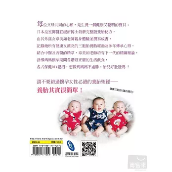 3.享譽中、日的防癌之母莊淑旂博士之外孫女、養胎達人章美如老師生三胞胎,親身體驗獨特又有效的「莊淑旂博士養胎及坐月子方法」,得到驚人的印證,體質得到改善。因此章美如老師特將整套完整的養胎法訴諸文字與圖片,與所有讀者分享神奇的養胎法。