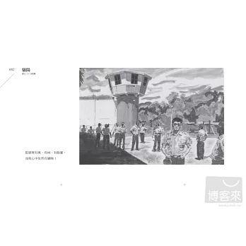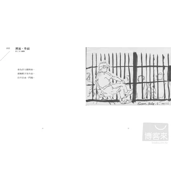 自此,他以一日一畫的方式,速寫監所的人生百態,包括受刑人的親友探監、工作勞動、生病就醫、打飯洗衣等等的生活日常。他以一雙看盡世事的雙眼,為我們重現監獄內的人生風景:煙毒的廚師、揮刀的外勞、偷竊的老兵、從良的黑道……他們身上折射出來人性的光明與黑暗,身而為人的喜怒哀樂,命運和機會的選擇題,值得我們社會大眾細細感受思考。
