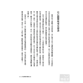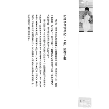 看了你的書好憾動喔!我才結婚半年,還沒有小孩。因我是一個愛講故事給學生聽的老師。也常常告知父母要多講故故事給孩子聽、陪陪小孩。但他們給我的答案都是:沒時間。現在有你的書當最好的榜樣,希望能藉由你的書引起更多的回響,讓台灣的小孩得到應得的幸福與正確的教育。