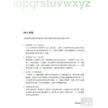 離考試只剩下10分鐘!這時您所需要的不是一聽就要聽上6、7個小時才能把全書聽完的多益單字書,而是需要本書特製的『考試前10分鐘的衝刺』MP3內容,利用考試前10分鐘用聽的再度加強TOEIC出題頻率最高的單字群。老是在700多分徘徊,達不到自己想要的800多分、900多分,這時您需要的則是本書的『征服多益滿分單字』MP3內容,利用10天的時間,用聽的徹底突破自己的學習極限。本書特製的四種版本MP3,絕對能根據不同的狀況,配合各種學習需求!