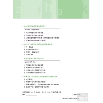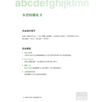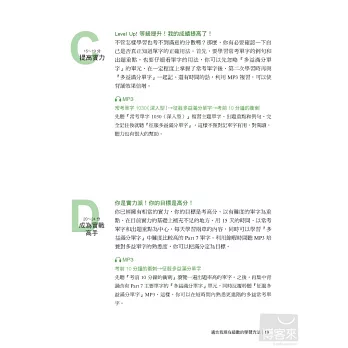 以往很多準備多益的考生,往往一拿到單字書就死命的從第一頁背到最後一頁,這種做法常常把自己累得半死,考試完後卻發現自己的成績並沒有進步多少。其實,我們已經熟到不能再熟的部分,如果還花大半的時間去學習,那只是浪費精力而已,真正最有效率的做法,應該是先了解自己的弱點後,針對自己的弱點來加強,本書不同於以往的單字書,絕對不會讓讀者用這種蠻幹的做法來記單字,讀者可以先翻到p.16頁,做完「診斷測驗」並計算自己的分數後,就可以很清楚的自己單字學習不足的地方,以及未來應該加強的方向。