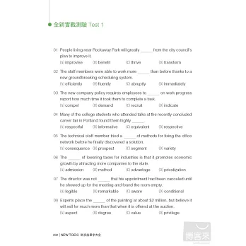 雖然多益考試的題型不外乎是官方公布的「照片描述」、「應答問題」、「單句填空」、「短文填空」那幾種,但是測試考生的考題方向(例如:測試對詞性的熟悉度、對廣播裡面會出現的單字熟悉度等)則會跟著每年考試結果的統計報告不斷地做調整,而且隨著考生能力的增加,多益考試題目也會跟著進化,因此,舊有的試題會漸漸的失去模擬真實考題的能力。有鑒於此,本書《NEW TOEIC新多益單字大全》【實戰測驗更新版】身為多益測驗準備的指標用書,有責任與義務將書中所有已經不適用的模擬試題全數翻新,帶給所有愛用的讀者更新、更準確、能獲得更多分的模擬考題。