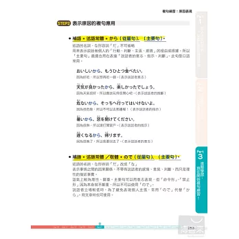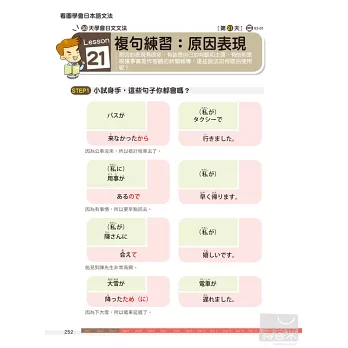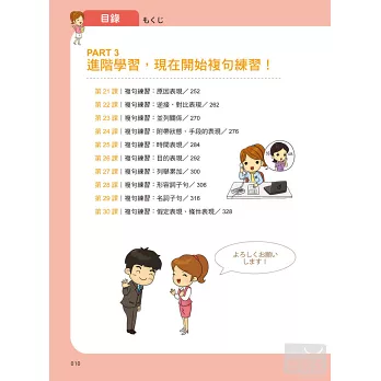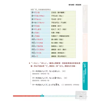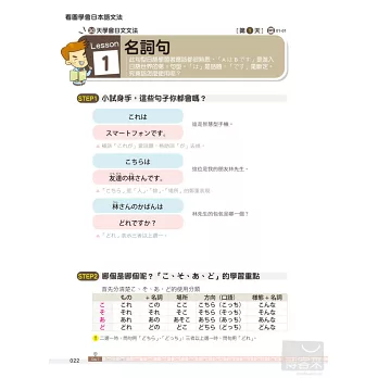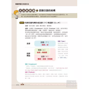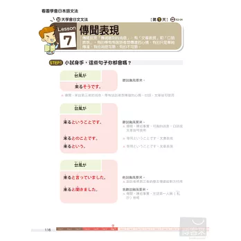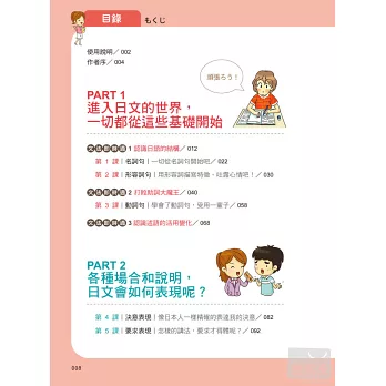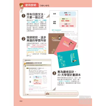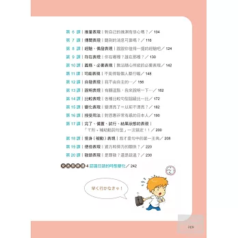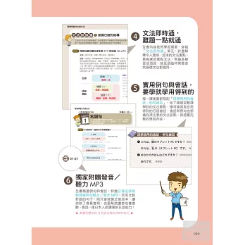 除了每一課的學習內容,更特地在各章節中穿插文法即時通單元,補充學習日語一定要懂的文法知識,搭配圖表解說,學習重點一目瞭然。
