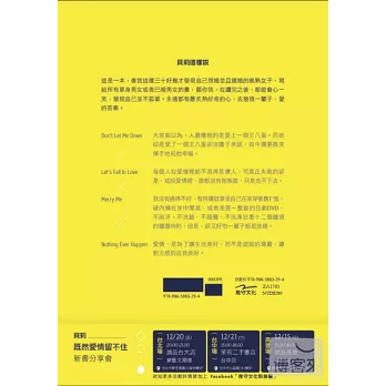 我想過了現在之後,就再也寫不出這樣的書了,這是三十幾歲的我,所能寫出最誠實,也最直接的一本,關於你我,在習得愛跟寂寞的過程裡,特別的一本書。By 貝莉