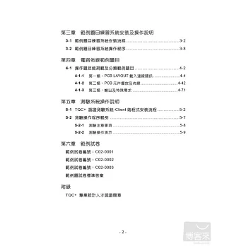 本書主要針對專業實作型考科「TQC+ 電路佈線OrCAD 16.5」有詳細的介紹,認證內容共分成三大類,包含:PCB LAYOUT載入連線關係、PCB元件擺放及佈線、輸出及特殊需求等。