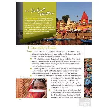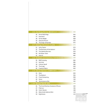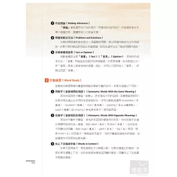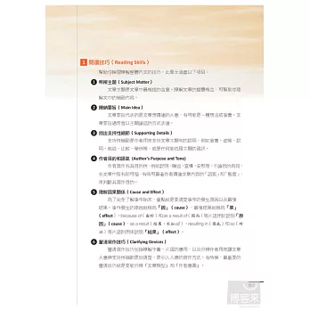 閱讀技巧(Reading Skills):包含明辨主題(Subject Matter)、歸納要旨(Main Idea)、找出支持性細節(Supporting Details)、明瞭作者目的和語氣(Author’s Purpose and Tone)、理解因果關係(Cause and Effect)等實用閱讀技巧。每一小節針對各閱讀技巧撰寫,引導讀者聚焦閱讀方向,幫助釐清思考。