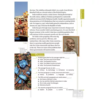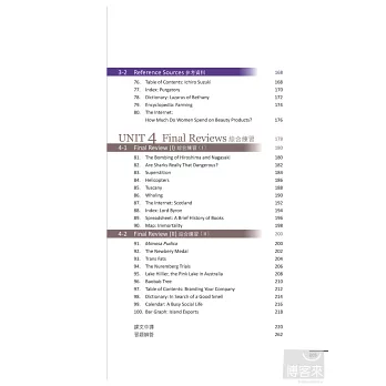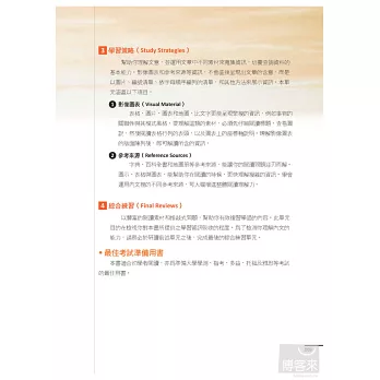 綜合練習(Final Reviews):提供大量豐富有趣的知性文章,和綜合全書學習重點的閱讀測驗,持續練習,累積閱讀技巧,增進閱讀能力。