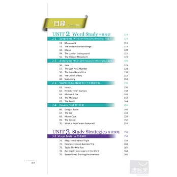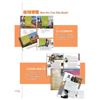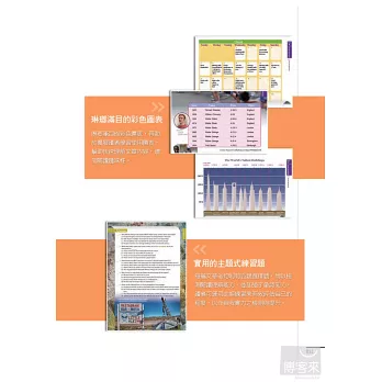 根據每單元學習主題,左頁文章,右頁立即練習。精心設計的閱讀練習題型,讓讀者透過實際演練,將閱讀技巧內化為個人能力,藉由持續練習進一步累積技巧。