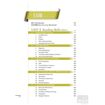 本套書分1-4冊,每冊各有100篇文章及閱讀測驗,以訓練英語閱讀為目的,讓讀者藉由閱讀技巧的訓練,提升閱讀能力、技巧與速度。依學習主題分四大單元,各單元內容針對一學習重點撰寫,包括閱讀技巧(Reading Skills)、字彙學習(Word Study)、學習策略(Study Strategies)、綜合練習(Final Reviews),並配合大量閱讀測驗題。文章主題包羅萬象,囊括各類領域,如文學、藝術、史地、人物、科技、生物、經濟等皆涵蓋其中。
