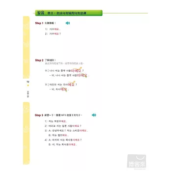 首爾大學教材的最大優點之一,即是每一堂課皆有「發音」單元,初學者不必囫圇吞棗地一次記完所有發音,可以循序漸進透過3個步驟練習每一課的發音主題。
