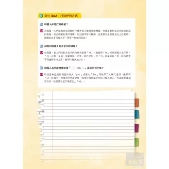 這些韓國獨有的文化,可以透過每課的「文化漫步」單元來了解而且還詳附「文化Q&A」,讓你對韓國文化印象更加深刻。