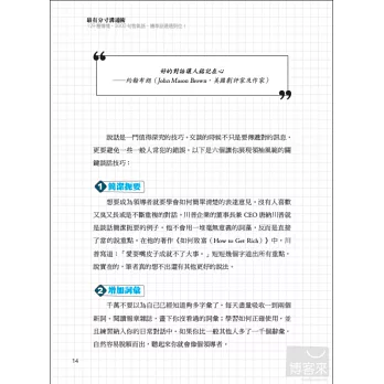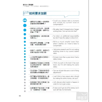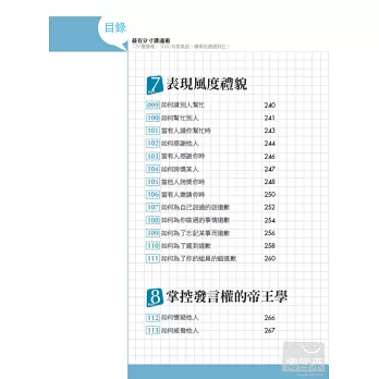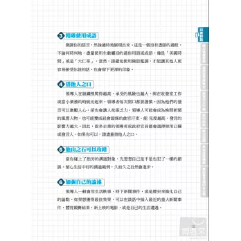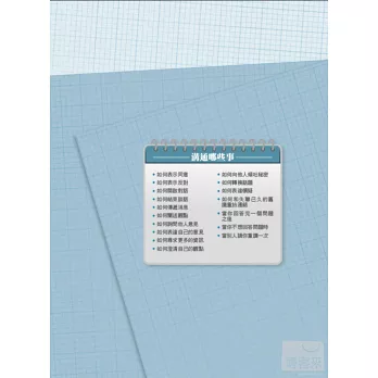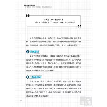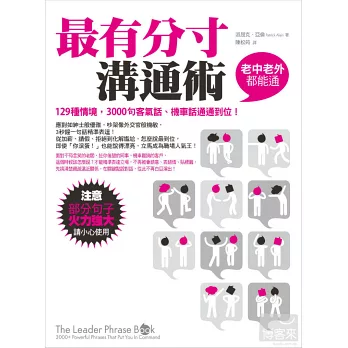 不管你已經多麼成功,你的說話與聆聽技巧應該還可以更上一層樓。書中的技巧能夠加強你的中英文語言能力,進而展現出你的自信與領導風範。只要你在每個場合都能說得鞭辟入裡、恰到好處,保證不管於公於私你都會有意想不到的收穫。