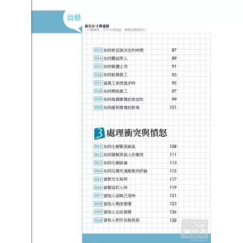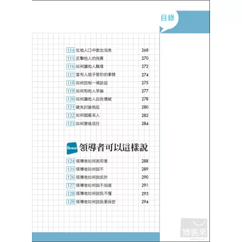本書列出許多能讓領導者脫穎而出的應對語句,是書界創舉。我的目的是和大家分享這些談話亮點,讓你不管在任何場合都能展現出可靠、高信服力的領導特質。過去,想要更上一層樓的經理人會參加大大小小的研討會以獲取幫助他們升官的技巧;這一套已經過時了。現在你爬得越高,越要隨時準備好運用強而有力的語句來激勵人心和下達指令。最高境界是內化這些句子成為你生活的一部分,隨時隨地都能脫口而出。因此,本書分成八大部分,簡單易懂,最後還附贈紅利放送區(Bonus)。