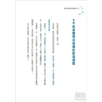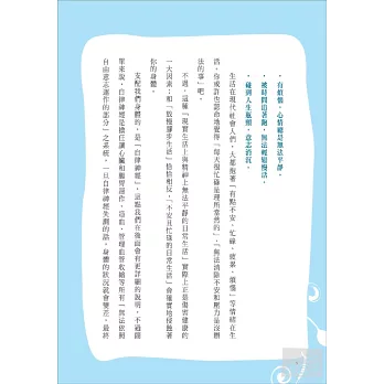 真正的健康,不在於身體是否有病,而是關於你血液、以及自律神經的協調運作,所以,真正的健康法,是包羅萬象的,他能幫你在工作中提高效率、讓你的人際關係獲得改善、調整你的情緒、指導你正確的時間管理,當然,最重要的,是幫助你找到真正輕鬆快樂的慢活人生!