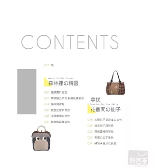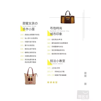 本書由台灣羽織創意美學有限公司號召四位資深拼布人,設計出26款別出心裁的手作布包,借重四位作者的創作特色,完成四款風格&主題單元的特色布作。
