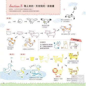本書包括:簡單逗趣、時尚多彩、童話可愛、柔美溫柔、俏皮繽紛等五種風格,從可愛的動物大頭貼、人物動作教學、日常交通工具、裝飾性文字運用,以及將可愛塗鴉運用在手帳、標籤、立牌、祝賀小卡上,利用紙膠帶、布料、手機殼,讓可愛插圖豐富我們的小日子~