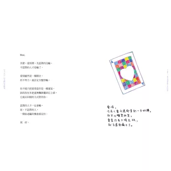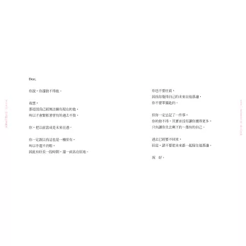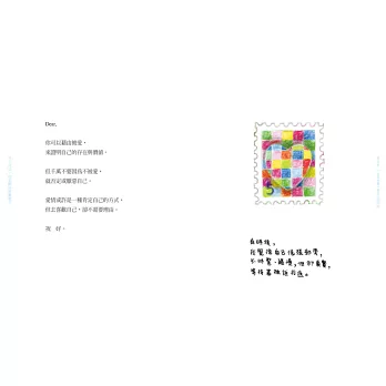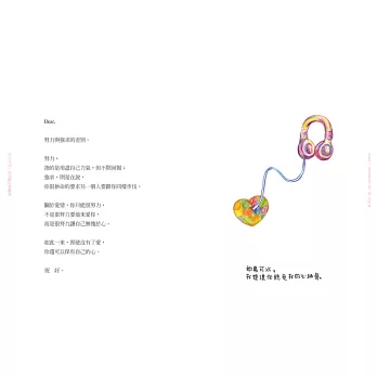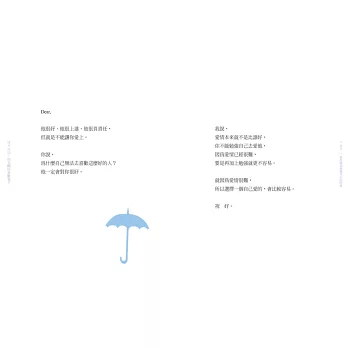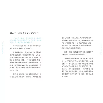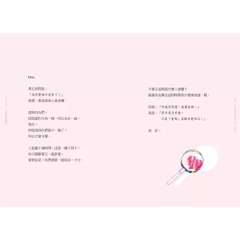 這本書就像是朋友留在你桌上的打氣紙條,沒有負擔、沒有強迫,希望能夠陪伴著所有還有愛卻害怕的人,度過一整年的時間,在最孤寂無助的時刻,隨意翻開任何一頁,就算是隻字片語都能帶給你力量、讓你獲得慰藉。