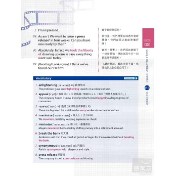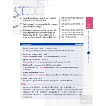 分為「開會前準備」、「開會現場」與「會議後續事宜」三大篇章,共16個主題,完整涵蓋會議各階段必須注意的細節。從開會前的準備如場地、會議通知及議程,到開會時有效主導議題、討論產品開發/宣傳策略、與客戶洽談合作案或商討合作細節,和公司重要的年度預算、營運計畫及股東會議,以及會議過後整理會議記錄等後續事宜,豐富實用的內容讓您一次掌握職場必備的開會英語。