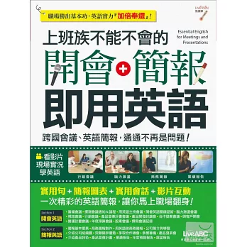 為了幫助有心站穩國際市場的商務人士,本書精心規劃了「開會英語」與「簡報英語」兩大部分,共30個實用主題: