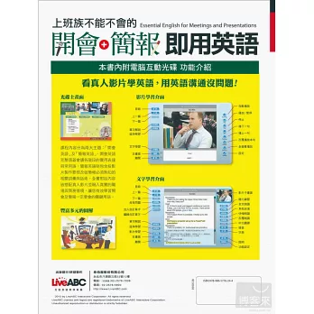 本書模擬各種常見的開會或簡報情境,方便讀者藉由真人影片對話來學習老外的正確發音與表達。建議讀者可以先看互動光碟裡的影片,在「影片學習」模式下把中英文字幕關掉,即可訓練聽力,亦可以利用「角色扮演」功能來練習口說發音。另外,無論是互動光碟裡或是書上都有以中英對照呈現的對話內容,方便讀