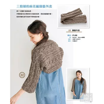 本書收錄20種編織基本技法&24項人氣小物,包括披肩、圍巾、脖圍、襪套、斗篷、帽子與手套等,深富質感。詳細介紹各種編織記號與織法、配色線的替換方法,練習時邊織邊記,印象深刻。即使是基礎作品,善加變化,也能創造個人風格。