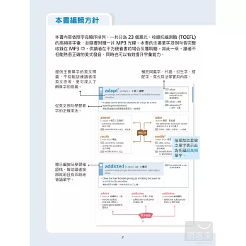 本書將托福測驗(TOEFL)的高頻率字彙都收錄於隨書附贈的MP3光碟中,除了主要單字以外,所有的例句也完整收錄,供讀者在不方便看書的場合反覆聆聽,如此一來,讀者不但能熟悉正確的美式發音,同時也可以有效提升字彙能力。相信透過收錄這些托福高頻單字,以及對這些單字的超強整理,必能大幅提升字彙能力,掌握托福考試的致勝關鍵,讓你在考場上無往不利、獲取高分!