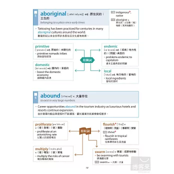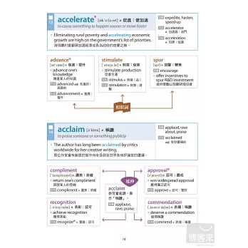 本書在主要單字下方提供了九大延伸學習架構。這除了可以讓讀者在學習單字的過程中不再感到枯燥乏味外,更能讓讀者在不知不覺中充分擴充單字量,使得舉一反三不再是件難事。