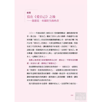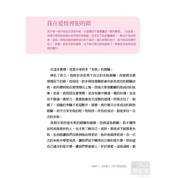 她不想告訴你如何在愛情裡當一個聰明厲害的人,不會告訴你要用什麼技巧才能得到愛情,也不會告訴你,什麼絕對是對的、錯的。她想寫的是,我們如何從失敗中得到教訓、從挫折中成長。