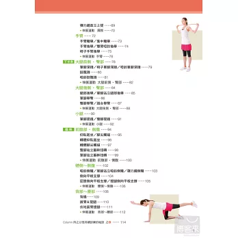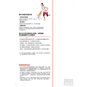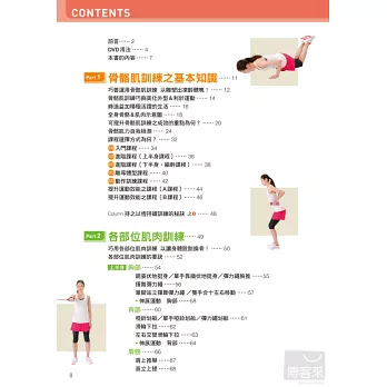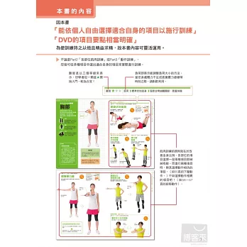 本書特別設計雕塑體型的課程。很多女孩子不喜歡鍛鍊肌肉,怕會練出過於壯碩的身材,其實想要擁有不容易發胖的體質,最簡單的方法就是提升肌肉量。雕琢體型課程會搭配有氧運動,有效減掉脂肪,藉由肌力訓練,緊實手臂與大腿,消除小腹以及提臀,調整全身曲線打造完美身材!