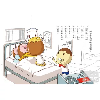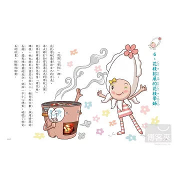 後來,眼看這本小書成了小天下「故事奇想樹」系列中的「當紅炸子雞」,每次去書店都看到它擺在最明顯的地方,我才好好的去讀了一遍這本香噴噴、甜蜜蜜的「點心書」;這才真正明白,這套小書的「魅力」所在──原來,哲璋不但善用「食材」,更善用「語言料理」,把許多關於食物、味覺的成語、俚語、名言、典故、歇後語...用雙關的方式,拆解、混搭,製造出許多幽默趣味的效果,讓人印象深刻!難怪小孩不分年齡,都會喜歡!