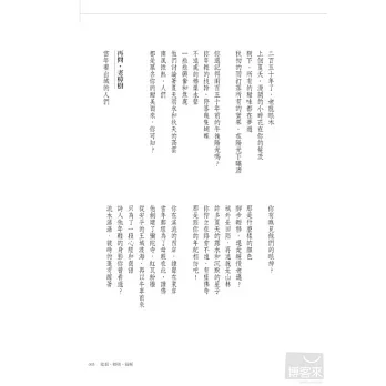「見到年老又盲的母親,你哭了嗎?這是大時代的滄海一粟小故事,卻是許多無奈與壓抑。少小離家,台灣的第一印象是日軍撤退離棄的美麗建築與老榕樹,神奇的人生境遇。」