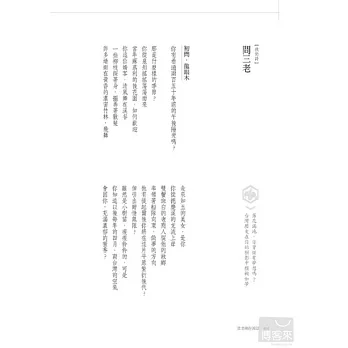 沈葆楨與樹蘭、鄭成功與梅樹、八田與一和南洋櫻……王浩一帶我們重返歷史現場,以詩說故事,以散文作傳,在樹上繫著歷史的絲帶。從今爾後,令我們能以更鮮活的虔敬認識他們,細細拜讀每一棵老樹、如一頁頁史詩。