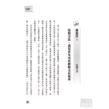 「多數父母不了解,撫養快樂、健康和成功的孩子是門科學,老師們花了幾年時間學習這門學問,研發他們的技巧,但是鮮少有父母親從這種專業知識中受益。霍娃太太和萊絲老師從多年來教導與照顧孩子的經驗,撰寫這本淺顯易懂而且非常實用的書籍,每位父母都能從中找出寶貴的訣竅,幫助他們的教養工作更為輕鬆也更為有趣。」--勞倫斯‧莎碧羅(Lawarence E. Shapiro)哲學博士《兒童的語言密碼》(The Secret Language of Children)作者