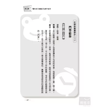 「幼教老師的錦囊妙計」遊戲 每個教養技巧後面都附有幼兒園老師實際運用的有效遊戲,輔助父母在家使用。