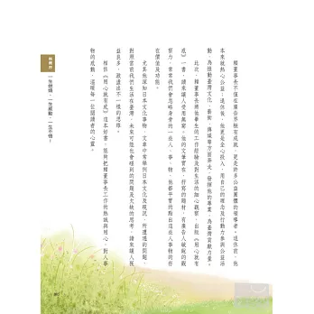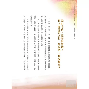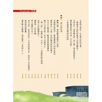 作者深知日本文化事物,書中舉例日本文化、現況及所遭遇的問題為例,再對照當前臺灣,提出可能會碰到的問題及欠缺的思考,建議出在工作、在生活,更好的思考模式。