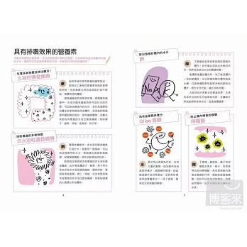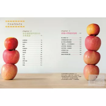 本書分成三章節<排毒水果事典>、<依各種煩惱所設計的水果食譜>、<排毒水果瘦身指南>。我尤其喜歡<依各種設計煩惱所設計的水果食譜>這個章節,作者利用水果的營養療效進而改善許多常見的女性煩惱,如皮膚乾燥、黑斑、美白等各種問題。而<排毒水果瘦身指南>則以水果入菜作為瘦身菜單,以及利用六日重整體質的排毒水果特製全餐,教導正確的瘦身概念,以進行均衡健康的瘦身計劃。