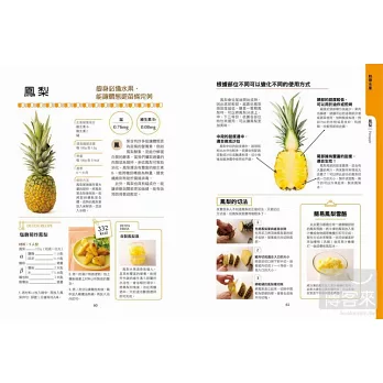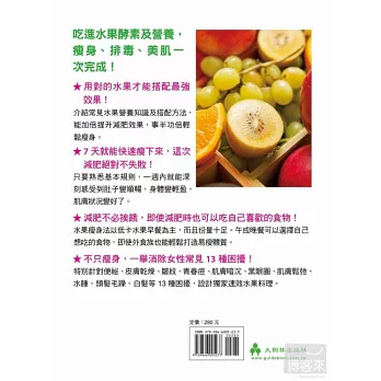本書作者對於每種水果的營養價值、維生素、膳食纖維、熱量皆有詳細標示,並仔細解釋水果對於人體的健康、肌膚和瘦身的影響。還有水果的種類介紹、保存方法及料理切法亦詳盡描述。