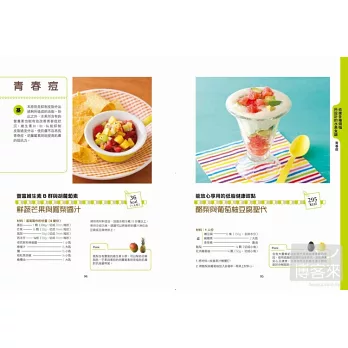 書中亦有許多養顏美容的水果創意食譜,如有美白功效的「西印度櫻桃香辣茄汁筆管」,還有消水腫的「哈密瓜酪梨濃湯」,打造健康亮麗秀髮的「芒果桃子豆漿奶昔」…等,每道食譜都是創意十足,強調樂活健康且簡單易作,是忙碌主婦人妻和上班族們的健康寶典和漂亮祕笈。