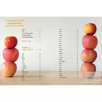 如蘋果,本書列出了主要營養成分是鉀和膳食纖維,每100g中含1.5g膳食纖維、110mg鉀,和54kcal熱量。除此之外,還細心的寫出盛產季節爲每年10-12月以及蘋果的保存方法。書中對於蘋果的描述:「蘋果含有大量水溶性膳食纖維的果膠,可排除腸胃的廢物。蘋果還含有鉀成分,能幫助排除體內多餘的水分,是排毒水果的代表。還有蘋果含有豐富的多酚,白色果實部分含有槲皮素,屬於類黃酮的一種;紅色果皮則含有花青素,具備強大的抗氧化能力。蘋果的維生素C與礦物質也相當均衡豐富,是具美肌功效十足的水果」