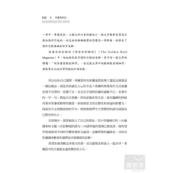 現在出版這本大師之作的時間真是完美!莎朗‧萊希特的註解把焦點專注在《與魔鬼對話》背後的真正天才,幫助我們征服那阻撓我們成功的恐懼。───哈維‧麥凱(Harvey Mackay),《紐約時報》暢銷書排行榜榜首《攻心為上》(Swim with the Sharks Without Being Eaten Alive)作者