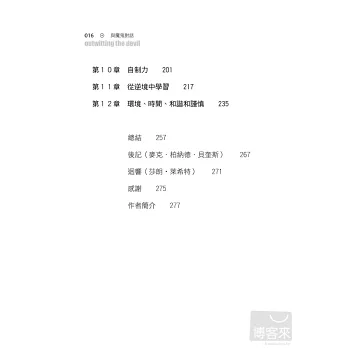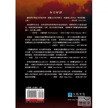 《與魔鬼對話》再次證明拿破崙‧希爾的知識和體系是不朽的。這本書包含許多見解,比方如何破除所有防礙成功的習慣和態度,還有會導致快樂和富裕的習慣和態度。如果你想要突破自己的路障,好好讀這本書!──哈福‧艾克(T. Harv Eker),《紐約時報》暢銷書排行榜榜首《有錢人想的和你不一樣》作者