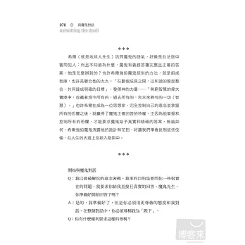 書中的內容,運用對話的方式,以一問一答,逐步迫使魔鬼自行就範和招供,一一破解魔鬼控制人類的各種方法和手段。