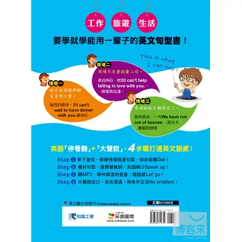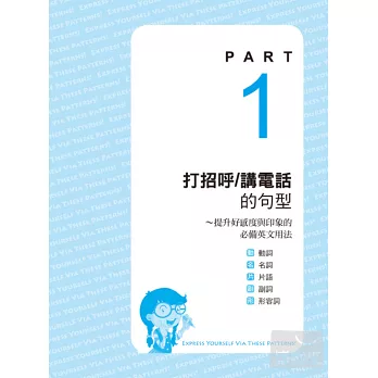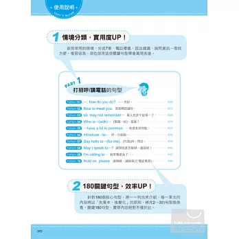 以情境為分類方式,從常見的打招呼/電話用語、到表達意願與提出建議...等等,以方便查找的分類架構,幫助讀者學會用途相近的英文,架構清楚,複習或使用時當然最方便。