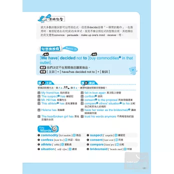 針對「句型換換看」的主要例句,除了中文翻譯之外,將補充例句解構,以幫助讀者了解其文法結構。替換單字時,也將點出替換詞的特性,同時對照文法結構與替換詞,就能靈活地套用句型。