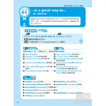 每一組「句型換換看」最後,將補充活用句型TIP,這部份的重點在「提升活用能力」,在替換詞之外,進一步補充例句的重點以及其他活用方法。