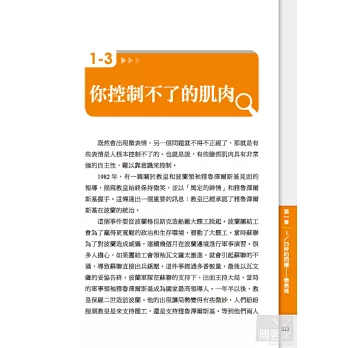 本書教你如何觀察眉毛、眼珠、眼睛、鼻子、嘴脣、下巴,有時簡單的一個動作,就代表不同的情緒。從視線方向、瞳孔擴張、鼻子伸縮、嘴脣舔咬、撫摸下巴等細微動作,對方的想法無意間就流露出來。