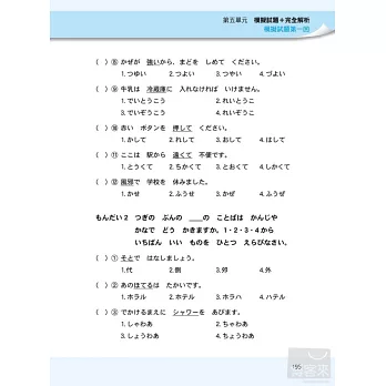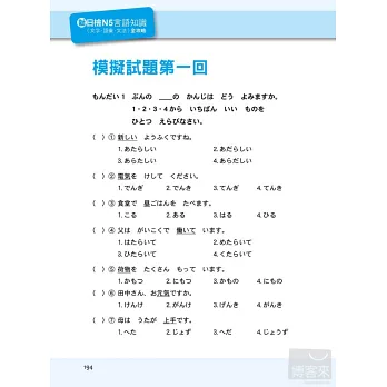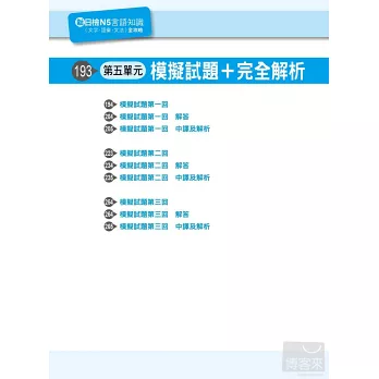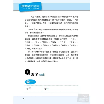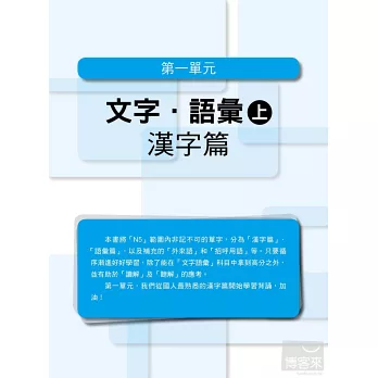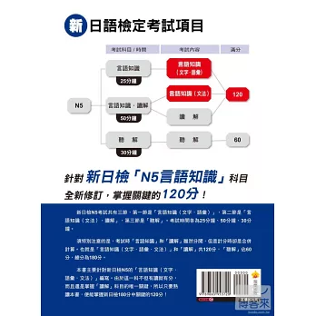 以「言語知識」而言,簡單地說,就是考「背單字」和「文法的了解度」。只要考生可以耐心的將本書所編列的單字和文型熟記在心,不僅可以應付文字語彙和文法的考題,連「讀解」也難不倒大家,因為閱讀測驗的文章,就是由這些單字和文型所組合而成的。至於大家聞之變色的「聽解」,其實也是一樣的道理,同學所謂的「聽不懂」,其實歸根究底,就是單字或文法不夠熟稔,造成有聽沒有懂的困境,只要考試中所說的每個字、每句話的意思你都可以了解,那麼何難之有?