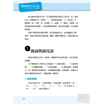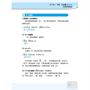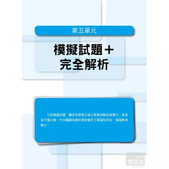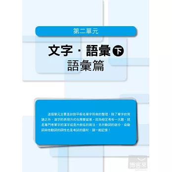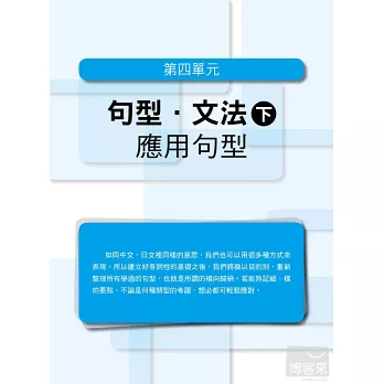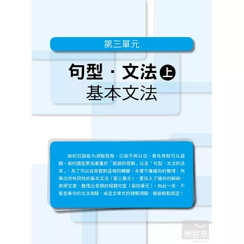 雖然「熟讀與熟記」聽起來非常容易,不過要怎麼讀到重點,要如何有效記憶,卻不是容易的事。這時就是本書發揮作用的時機了!針對「背單字」的部分,特地將所有相關的字整理在一起,幫助考生可以做到「舉一反三」的高效率記憶。「文法的了解度」則從二部分著手,先由最基本的詞性特色、重點切入,了解日文每個詞性的各種變化,如此便可輕易掌握,利用各詞性所衍變出來的基本句型。有了紮實的基本知識之後,再進一步融會貫通,達到根據目的別,運用所學的句型,如此便可在最短的時間內,精準地將日文的「點」(詞性特色)、「線」(基本句型)和「面」(集結句型而成的文章)一網打盡。